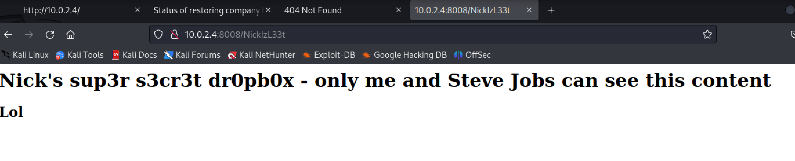 - 得到提示文本,发现一新目录,但是没讲具体位置,最后在8008端口的web服务上访问到该目录