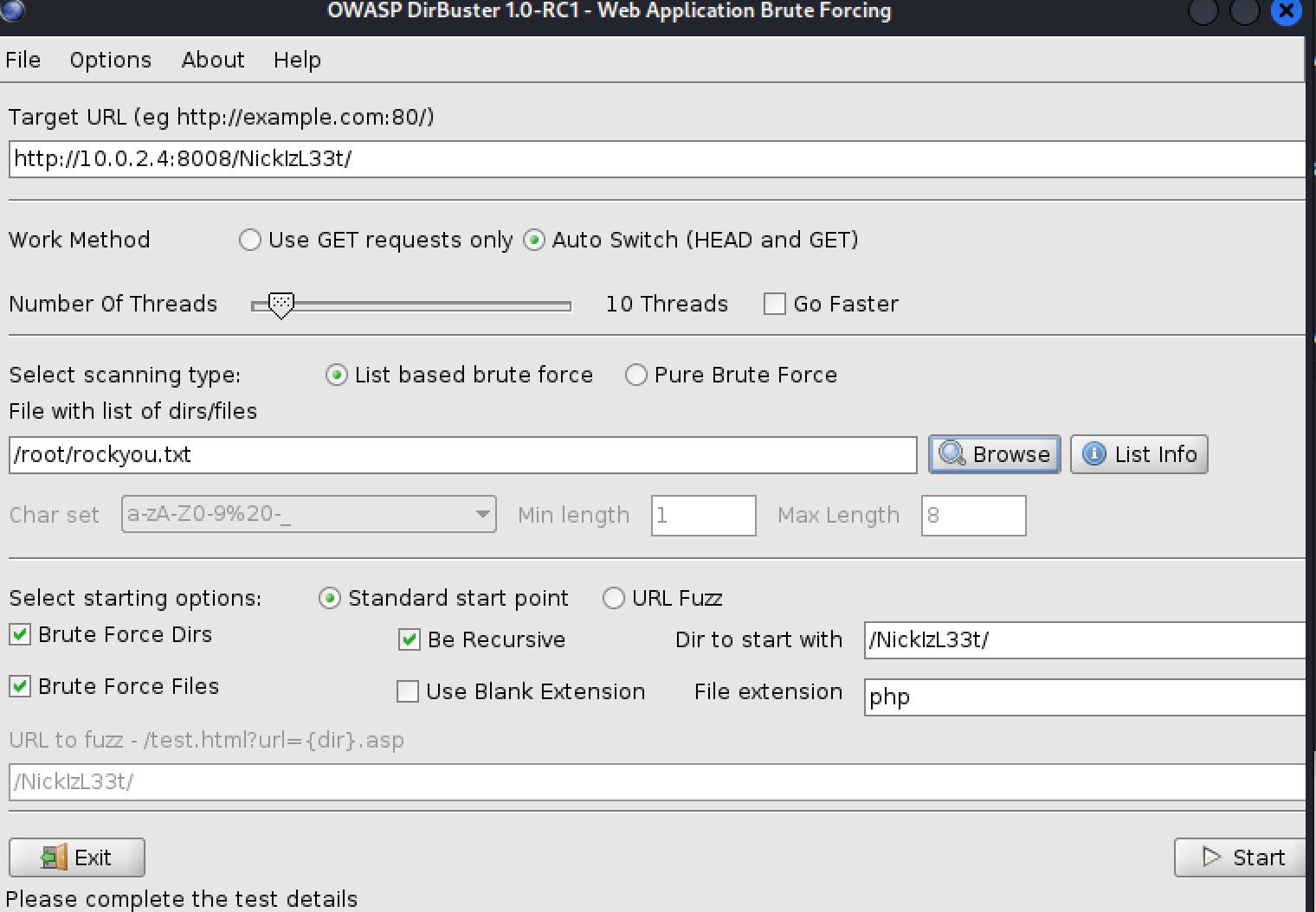 - 提示需要猜测网站正确的网页名,通过爆破得到网页名,我用的dirbuster(爆破不了一点,100线程就崩了,所以还是抄的)