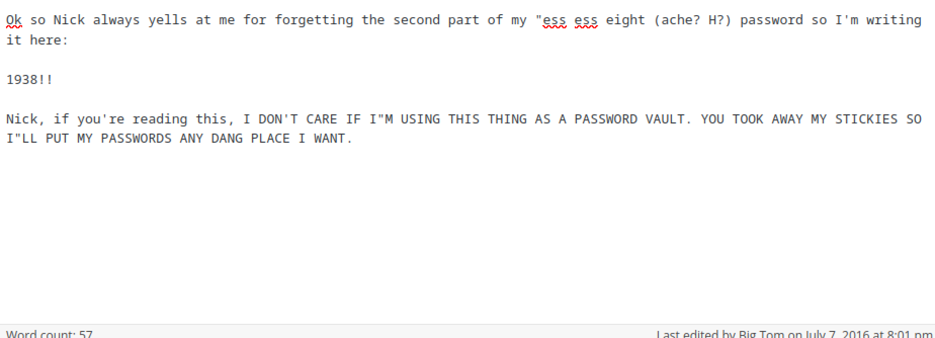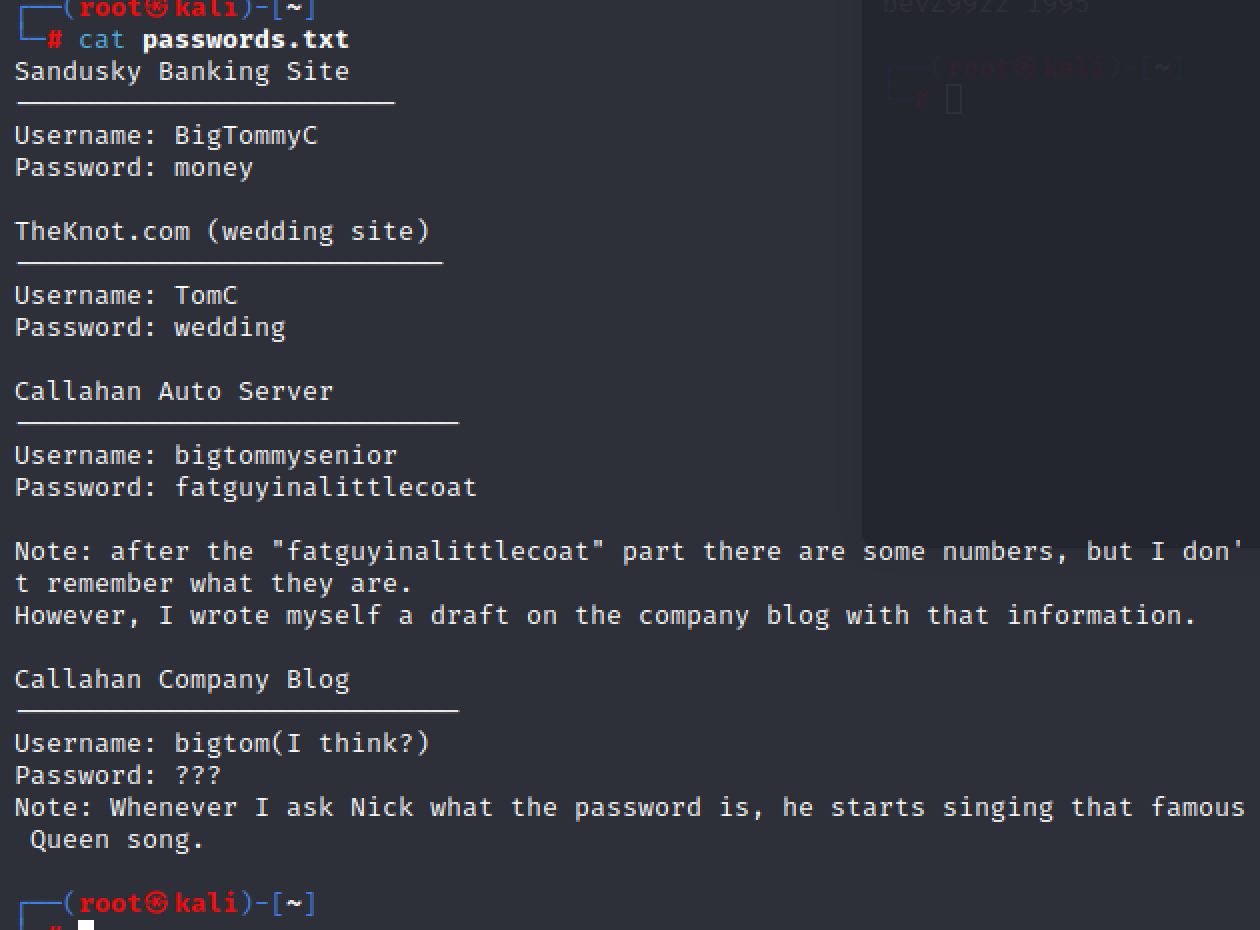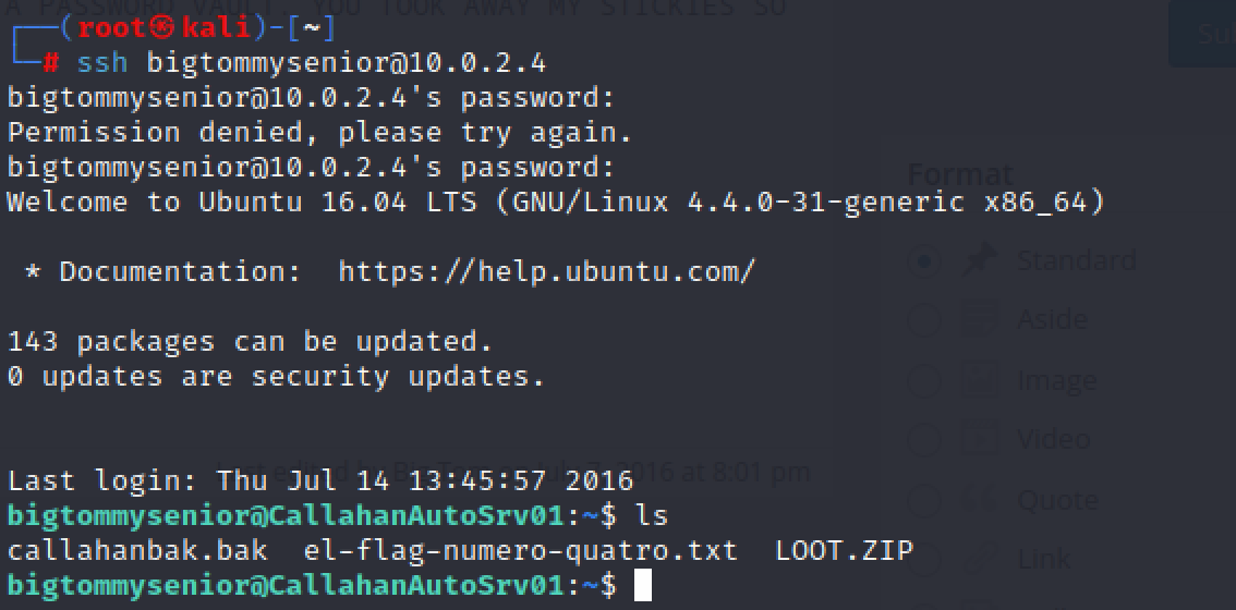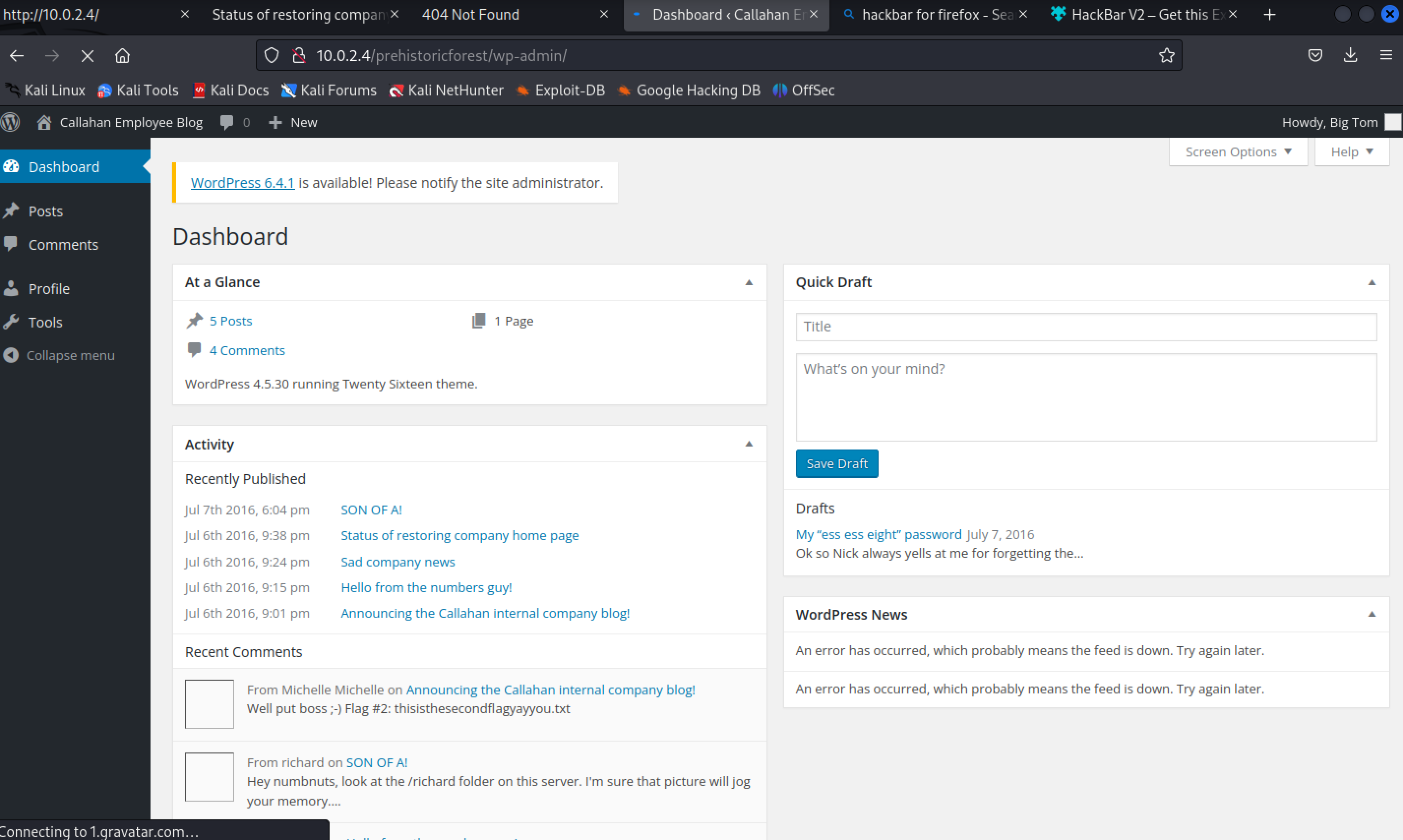 - 访问网站后台,在draft中得到密码提示,与hint中的第三对用户名密码拼接,通过ssh成功得到靶机shell