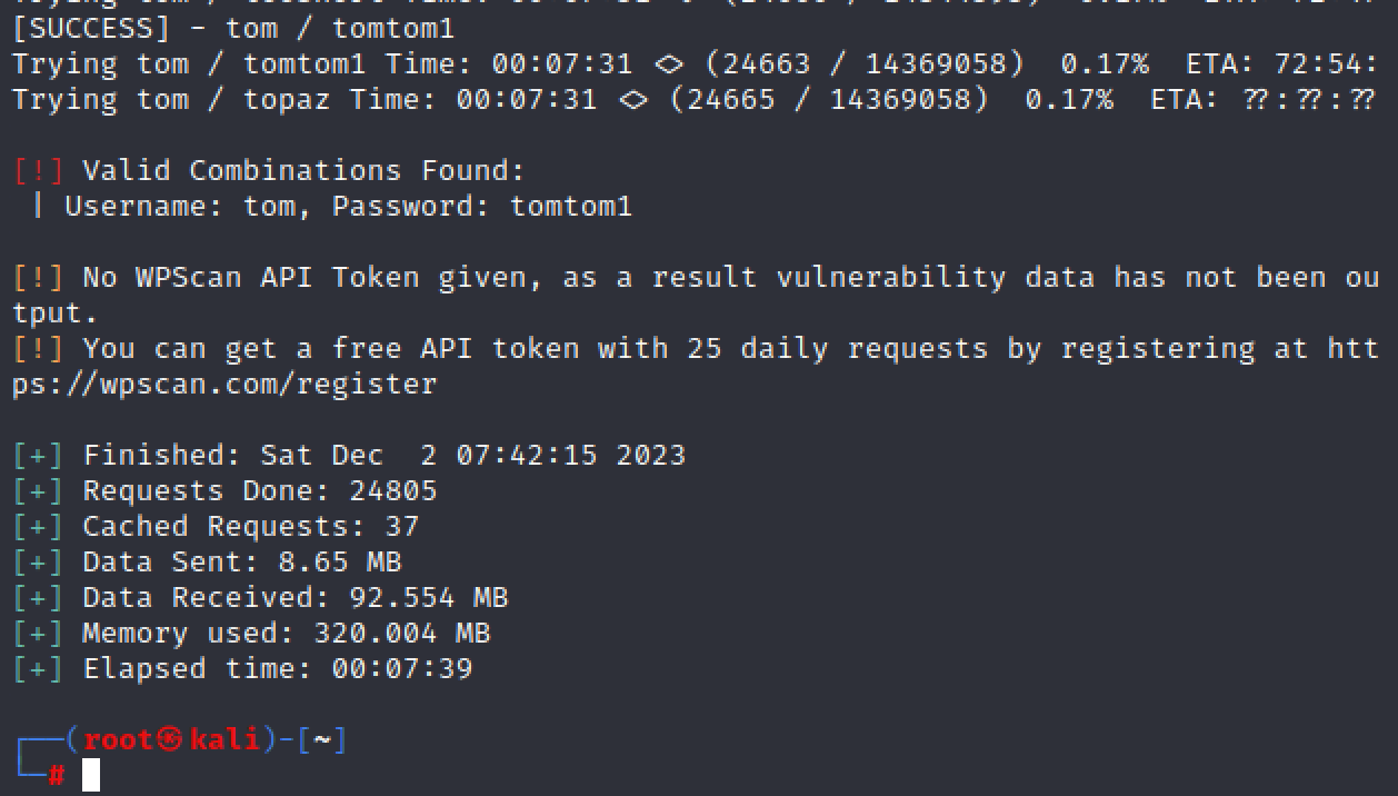 - 对tom用户进行密码爆破,字典是rockyou,用wpscan爆破