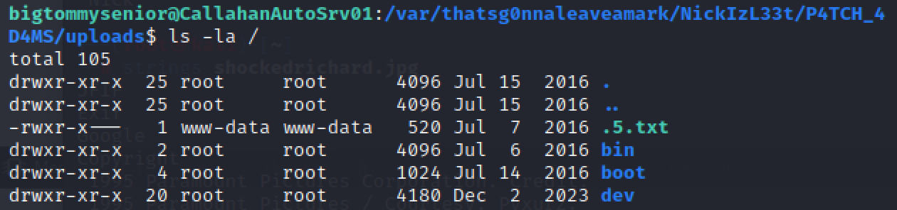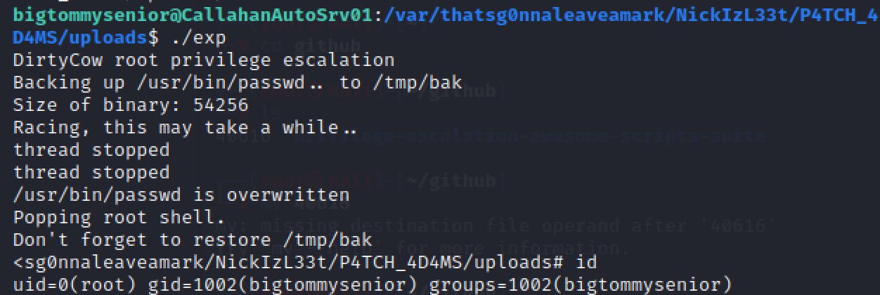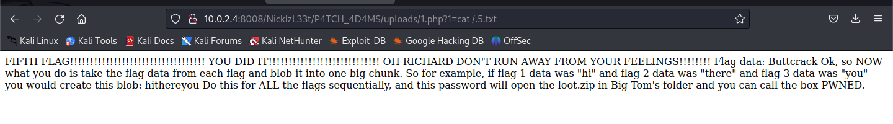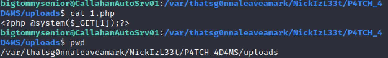 - 发现可以在/var/thatsg0nnaleaveamark/NickIzL33t/P4TCH_4D4MS/uploads写入webshell